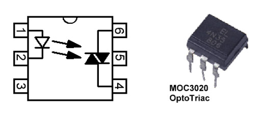 trennen. Dies erfolgt mittels eines Optokopplers. Die Abbildung 10 zeigt einen OptoTriac MOC3020 im 6-poligen IC Gehäuse. eine LED an den Anschlüssen 1 und 2 kann mit niedriger Spannung (z.B. 5V=) den Triac per Licht an den Anschlüssen 4 und 6 durchschalten. Man kann auch sagen, an 4 und 6 ist ein DIAC angeschlossen, welcher durch Licht (an Stelle eines Anschluss G) zum Durchschalten angesteuert wird. |