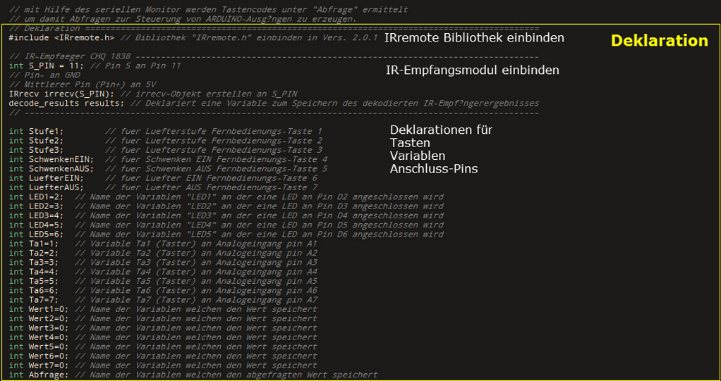 "IRremote.h" ist erforderlich und unter "Deklarationen"