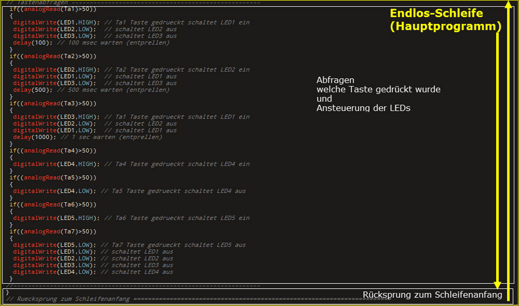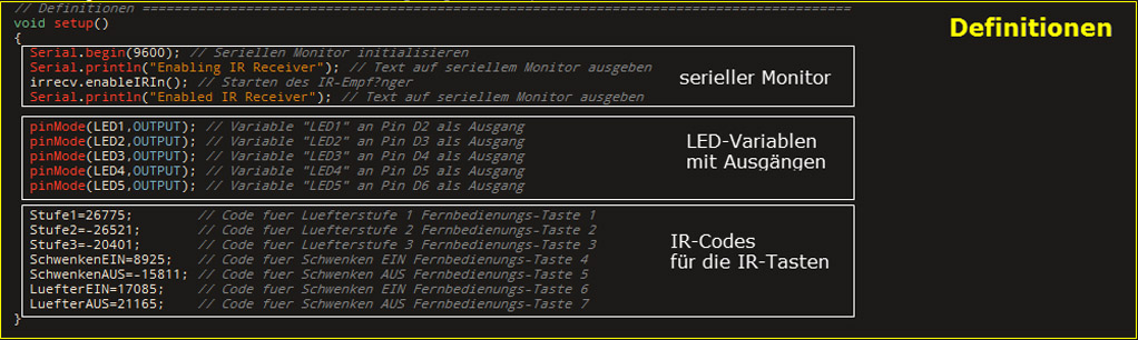 | Mit den nach Abbildung 3 ermittelten Tasten-Codes, dem Testaufbau der Abbildung 4, und dem zugehörigen ARDUINO-Programm der nachfolgen Abbildungen kann die Funktion dieser selbst gebauten Infrarotfernbedienung überprüft werden. Durch die im Listing angegebenen Kommentaren ist es dem Anwender leicht möglich das Programm individuell nach seinen Bedürfnissen zu ändern (anzupassen). Der Programmteil für den seriellen Monitor dient dem Anwender dabei zur Kontrolle und eventueller Programmkorrektur bezüglich seiner Änderungen. Wenn dann alles wunschgemäß funktioniert, kann bei einem endgültigen IR-Programm der Programmteil des seriellen Monitors natürlich entfallen. |