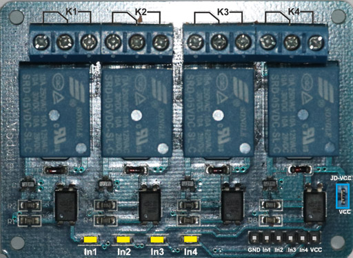 Relais vom gleichen Typ, wie in Abbildung 6. Die Besonderheit: Auf dem Modul befinden sich Treiber (Transistoren) zur Ansteuerung der Relais, Pins GND (Minus) und VCC (+5V=) und Schalteingänge IN1, IN2, IN3, IN4 für die 4 Relais, sowie 4 LED-Anzeigen In1, In2, In3, In4; ebenso die Schutzdioden für die Relais. Über jeweils 3 (K1 bis K4) Schraubklemmen (Relais-Mittelanschluss, Ruhekontakt, Umschaltkontakt) können Verbraucher angeschlossen werden (Maximalwerte wie oben bei Abbildung 6 angegeben). Bezugsquelle z. B. bei amazon für 6,99 € , Suchbegriff "ARDUINO Relaismodul" eingeben. Für 11,99 € ist auch ein Relaismodul mit 8 Relais erhältlich. (Stand März 2026) |
