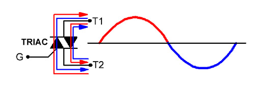 Der TRIAC ist ein Bauteil mit dem über die Anschlüsse T1 und T2 Wechselstromverbraucher geschaltet werden können. Das Ein- und Ausschalten erfolgt über den Anschluss G. Der TRIAC ist über T1-T2 in beiden Richtungen nahezu verlustfrei schaltbar. In Abbildung 8 ist dies für eine Sinus-Wechselspannung dargestellt: die positive Halbwelle in Rot und die negative Halbwelle Blau. |