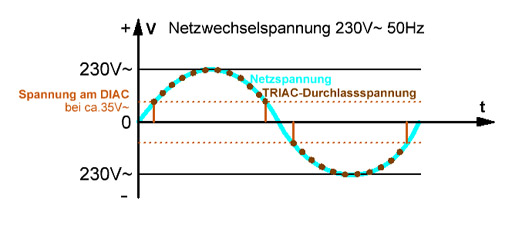 die braun punktierte Linie. Da ein TRIAC so gut wie verlustfrei schaltet, erzeugt er kein Verlustwärme und so können mit kleinsten Bauteilen Verbraucher mit Hohen Spannungen und hohen Leistungen geschaltet werden. |