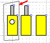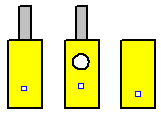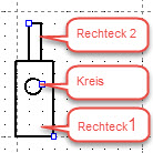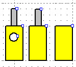 Stecker: Rechteck 1 markieren, Rechtsklick, Eigenschaften wählen, Mit Farbe ausfüllen, Ändern z.B. Gelb. Rechteck 2 markieren, Rechtsklick, Eigenschaften wählen, Mit Farbe ausfüllen, Ändern z.B. Grau. Kreis markieren, Rechtsklick, Eigenschaften wählen, Mit Farbe ausfüllen, Ändern z.B. Weiß. Die linke Abb.29 zeigt Ergebnisse für Stecker mit Querloch, Stecker, und Buchse. Aber noch sind daraus noch keine Symbole erzeugt worden (erkennbar, dass jedes Element ein Einfügepunkt besitzt, die kleinen blauen Quadrate). |