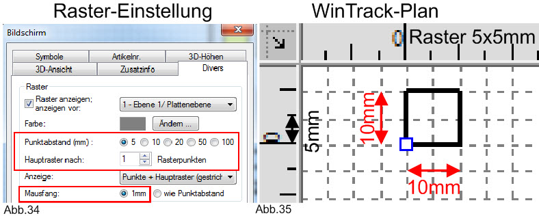 möglichen Einstellungen: Punktraster = 5mm, Hauptraster nach 1 Rasterpunkten, Mausfang 1mm. ![]() Mit diesen Einstellungen erscheint dann ein Raster im WinTrack-Plan, wie es Abb.35 zeigt. Das Raster kann nicht kleiner als 5x5mm eingestellt werden. Wählt man "Mausfang wie Punktabstand", so werden Punkte von Freihandlinien auf dieses Raster gefangen, also minimal in Abständen von 5mm, enger geht nicht! Bei Wahl "Mausfang 1mm" können Punkte von Freihandlinien minimal in Abständen von 1mm gesetzt werden. Hier ergibt sich aber das Problem, dass der Zoom von WinTrack nicht ausreicht, um Punkte von Freihandlinien in Abständen von 1mm exakt mit der Maus positionieren zu können! Symbole mittels Freihandlinien zu erstellen ist also eingeschränkt; ungeeignet, um sehr kleine Symbole zu erstellen, wie wir für Stecker eigentlich wünschen. Aber es gibt noch eine andere Möglichkeit kleinere Stecker in WinTrack zu erstellen, was nachfolgend beschrieben wird. |